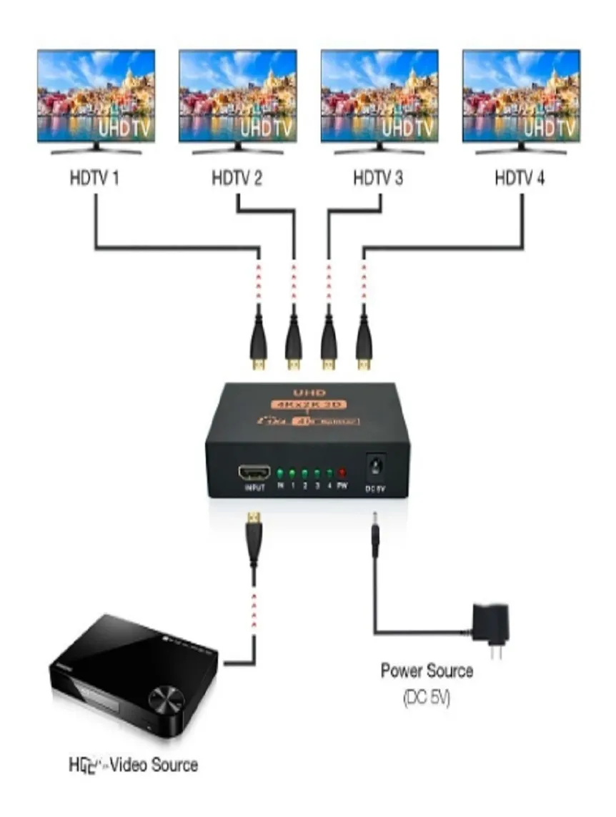 Con el Distribuidor HDMI 1×4, conectá una fuente HDMI y transmití contenido en hasta cuatro pantallas simultáneamente.