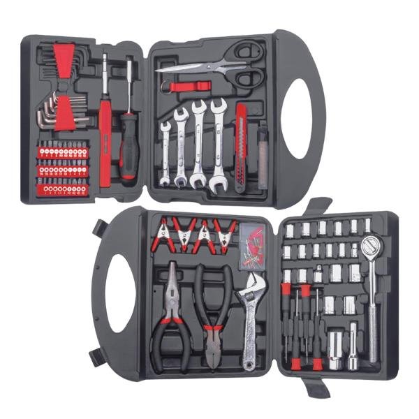 1 nivel, 2 juegos de llaves allen, 1 llave inglesa, 4 llaves fijas, q tijera, 1 destapador, maletín de transporte.