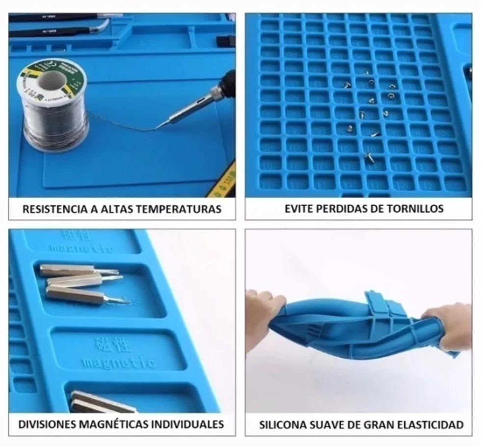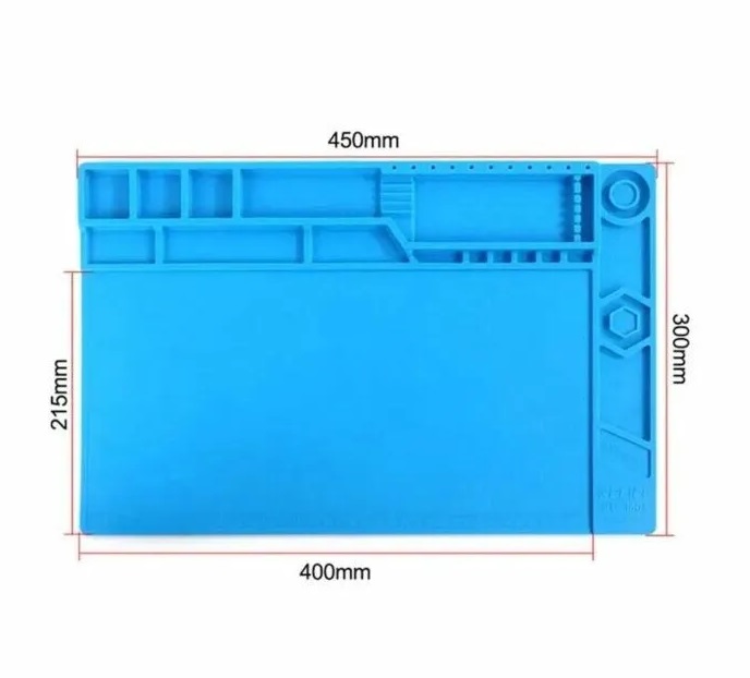 La manta térmica antiestática de 45×30 cm es una estación de trabajo de silicona diseñada para reparaciones electrónicas y soldadura, capaz de soportar hasta 500 °C.